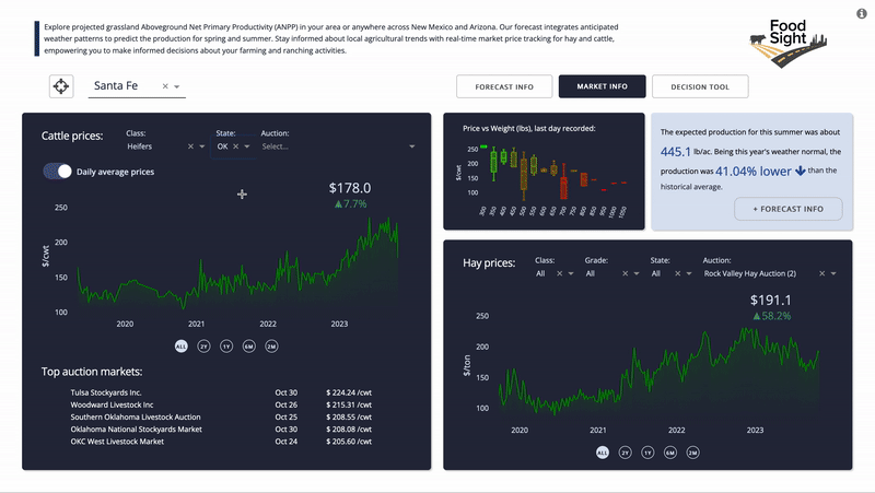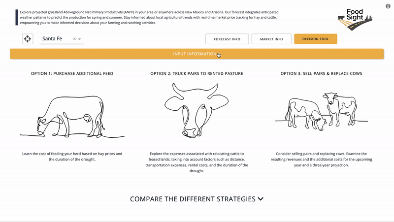 FoodSight is built around the central theme of a changing global climate and its escalating impact, such as intensified droughts, on ranching operations. The initial sections highlight these changes from two perspectives: the ecological impact on pastures and the consequential influence on market operations. In the “decision tool” section, insights from the previous sections converge, offering calculated suggestions for strategies to navigate drought events. Drawing from several strategies cited in the bibliography, the early version of the app delves into “Strategies for Beef Cattle Herds During Times of Drought” by Jeffrey E. Tranel, Rod Sharp, & John Deering of the Department of Agriculture and Business Management at Colorado State University. This tool is designed to help cow-calf producers weigh the financial consequences of various management approaches during droughts when grazing forage availability diminishes.