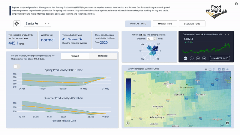 The integration of the Grasscast model into FoodSight offers users a straightforward way to explore grassland productivity forecast data, taking into account current climate scenarios from NOAA’s Climate Prediction Center. Users can view a summary of the current seasonal conditions for spring and summer based on their location or a selected area on the map. The tool allows users to click on or draw areas to get an overview of grassland conditions. This includes expected average productivity in the region, a comparison with historical productivity, identification of years with similar conditions, and access to historical records. Furthermore, it provides a preliminary view of potentially better pasture locations based on the user’s selected location, catering to those who may not want to delve deep into the interactive map.