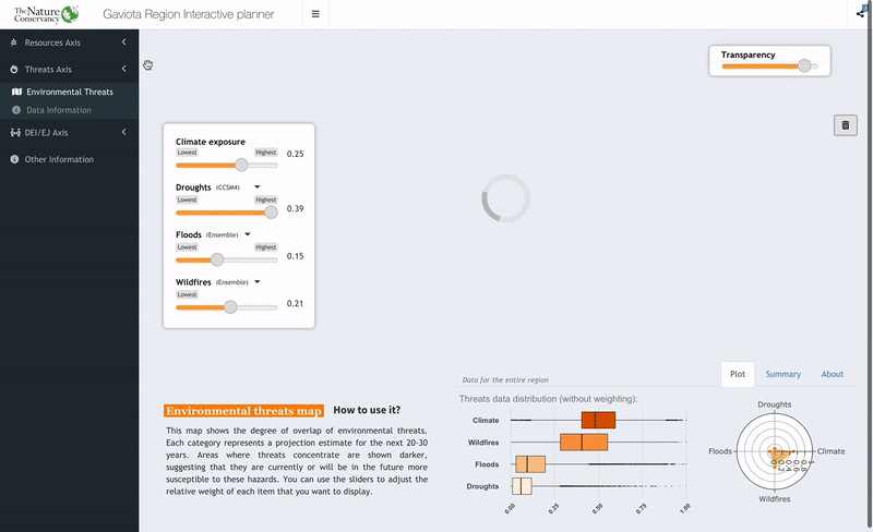 The application is designed to visualize and analyze spatial environmental data, with a focus on three primary axes: Natural Resources, Environmental Threats, and DEJ/EJ issues. Each axis contains multiple layers of data that define our region, highlighting areas of interest based on different metrics. Users can adjust the weight of each layer and view an aggregated representation of the data. Additionally, the app provides the ability to extract statistics for a specific area of interest selected by the user.